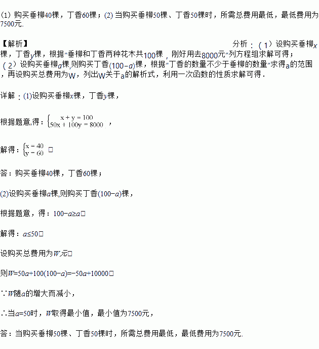 (1)若购进垂柳,丁香两种花木刚好用去8000元,则购买了垂柳,丁香两种花木各多少棵?