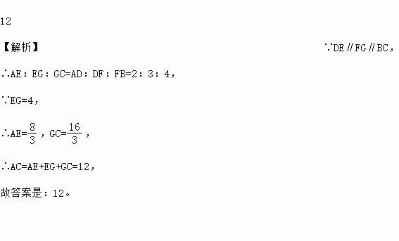 如图,△ABC中,DE∥FG∥BC,AD:DF:FB=2:3:4,若EG=4,则AC=__.