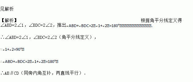 如图,BE平分∠ABD,DE平分∠BDC,且∠1+∠2=90°.