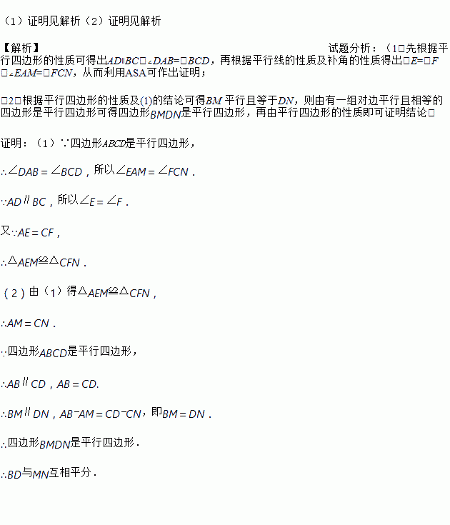 ÈçͼËùʾ£¬ÔÚÆ½ÐÐËıßÐÎABCDÖУ¬ÑÓ³¤DAµ½µãE£¬ÑÓ³¤BCµ½µãF£¬Ê¹µÃAE=CF£¬Á¬½ÓEF£¬·Ö±ð½»AB£¬CDÓÚµãM£¬N£¬Á¬½ÓDM£¬BN£®