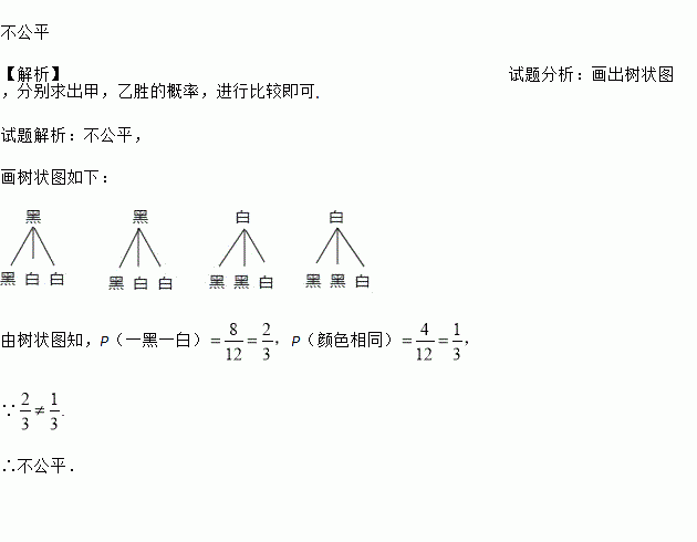 甲、乙两人做摸球游戏,在不透明的口袋里放入大小相同的两个黑球和两个白球,甲摸出两个球后放回,乙再摸出两个球,若摸出一黑一白甲赢,若摸出两个相同颜色的乙赢.这个游戏公平吗?为什么?