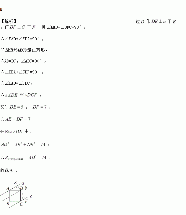 如图,四边形是正方形,直线, , 分别通过、、三点,且.若与之间的距离是, 与之间的距离是,则正方形的面积是( ).