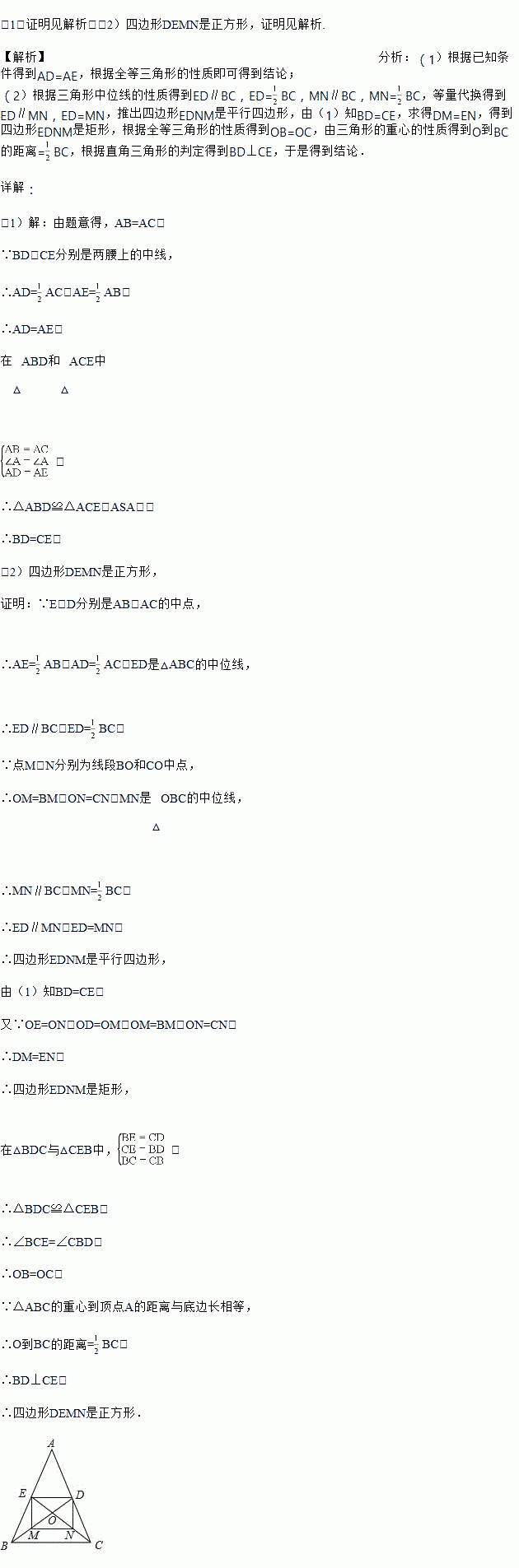 (2)设BD与CE相交于点O,点M,N分别为线段BO和CO的中点,当△ABC的重心到顶点A的距离与底边长相等时,判断四边形DEMN的形状,无需说明理由.