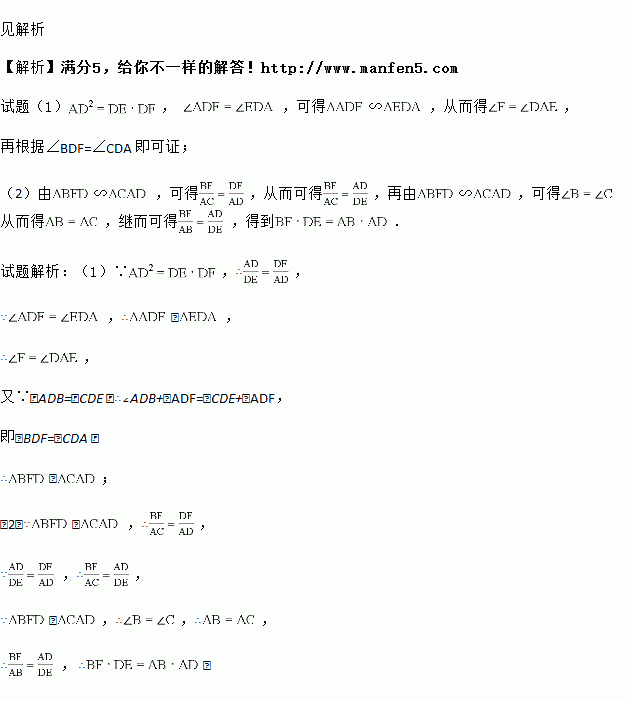 如图,在△ABC中,点D在边BC上,联结AD,∠ADB=∠CDE,DE交边AC于点E,DE交BA延长线于点F,且AD2=DE•DF.