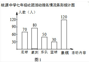 12.桃源中学为了丰富学生的校园生活,组织七年级同学开展每周一次的社团活动,活动内容有篆刻、足球、乐队、篮球、象棋5项.为了方便组织,规定每位同学只能报一项活动,根据报名结果绘制了统计图:(1)请将图1中条形统计图补充完整;