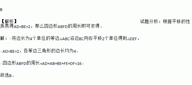 如图,将边长为4个单位的等边△ABC沿边BC向右平移2个单位得到△DEF,则四边形ABFD的周长为( )