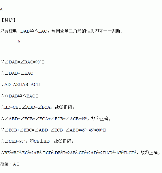 如图,点E在△DBC的边DB上,点A在△DBC内部,∠DAE=∠BAC=90°,AD=AE,AB=AC.给出下列结论: