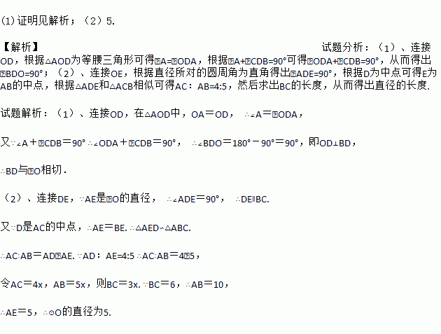 (1)证明见解析;(2)5. 【解析】试题分析:(1)、连接OD,根据△AOD为等腰三角形可得∠A=∠ODA,根据∠A+∠CDB=90°可得∠ODA+∠CDB=90°,从而得出∠BDO=90°;(2)、连接OE,根据直径所对的圆周角为直角得出∠ADE=90°,根据D为中点可得E为AB的中点,根据△ADE和△ACB相似可得AC:AB=4:5,然后求出BC的长度,从而得出直径的长度. 试题...