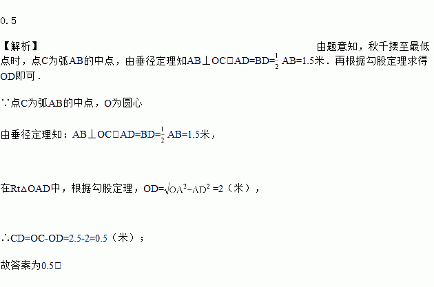 如图,小丽荡秋千,秋千链子的长OA为2.5米,秋千向两边摆动的角度相同,摆动的最大水平距离AB为3米,则秋千摆至最高位置时与最低位置时的高度之差(CD)为________米.