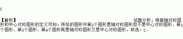 C 【解析】试题分析:根据轴对称图形和中心对称图形的定义可知:所给的图形中第2个图形是轴对称图形但不是中心对称图形,第1个图形、第3个图形、第4个图形既是轴对称图形又是中心对称图形,故选:C.