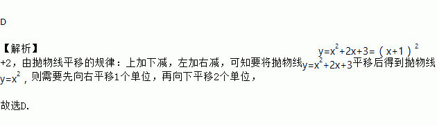 D 【解析】y=x2+2x+3=(x+1)2+2,由抛物线平移的规律:上加下减,左加右减,可知要将抛物线y=x2+2x+3平移后得到抛物线y=x2,则需要先向右平移1个单位,再向下平移2个单位, 故选D.