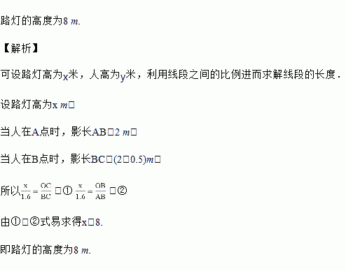 如图,一位同学身高1.6 m,晚上站在路灯DE下,他在地面上的影长是2 m,若他沿着影长的方向移动2 m站立时,影长增加了0.5 m,求路灯的高度.