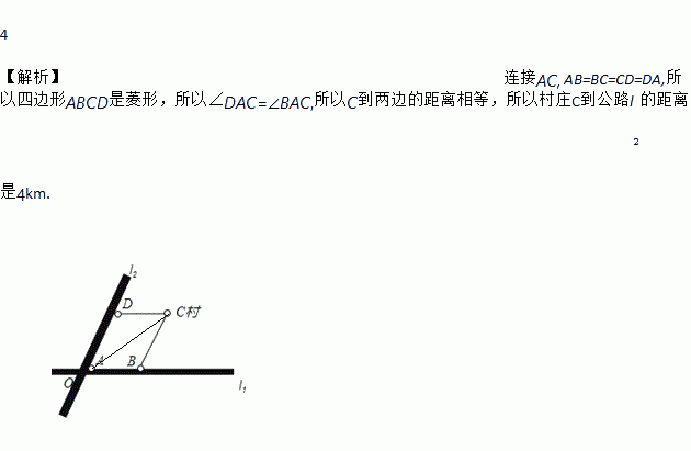 如图,两条笔直的公路l₁、l₂相交于点O,村庄C的村民在公路的旁边建三个加工厂A,B,D.已知AB=BC=CD=DA=5 km,村庄C到公路l₁的距离为4 km,则村庄C到公路l₂的距离是______km.