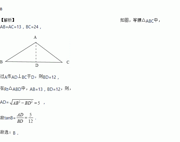 在△ABC中,AB=AC=13,BC=24,则tanB等于( )