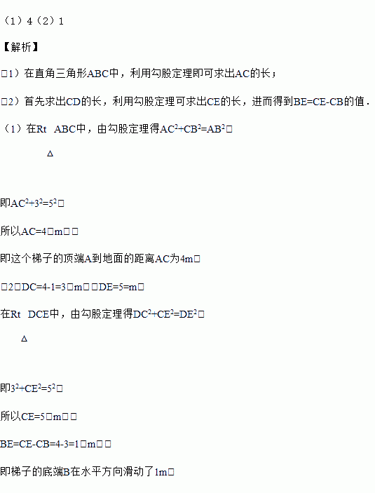 (2)如果梯子的顶端A沿墙AC竖直下滑1米到点D处,求梯子的底端B在水平方向滑动了多少米?