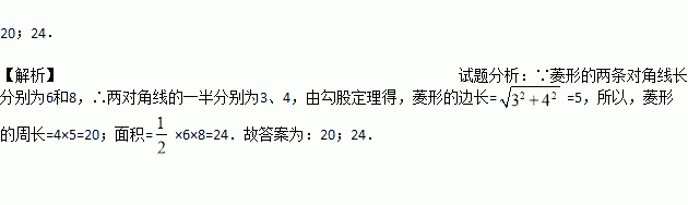 菱形的对角线长分别为6和8,则此菱形的周长为__,面积为__.