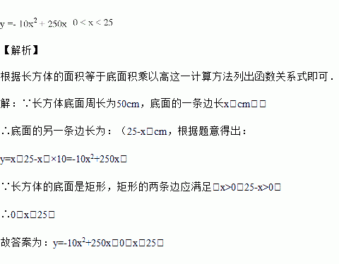 长方体底面周长为,高为,则长方体体积关于底面的一条边长的函数解析式是________,其中的取值范围是________.