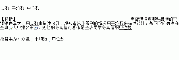 商店想调查哪种品牌的空调销售量大,用________来描述较好,想知道总体盈利的情况用________来描述较好;某同学的身高在全班57人中排名第29,则他的身高值可看作是全班同学身高值的________.(填“中位数”“众数”或“平均数”)