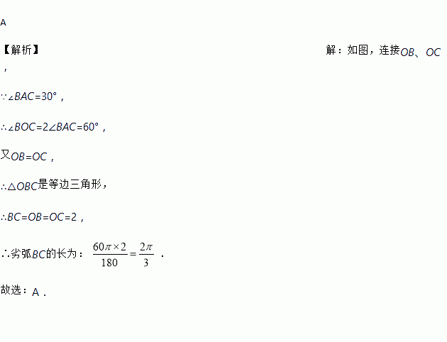 如图,⊙O是△ABC的外接圆,BC=3,∠BAC=30°,则劣弧的长等于( )