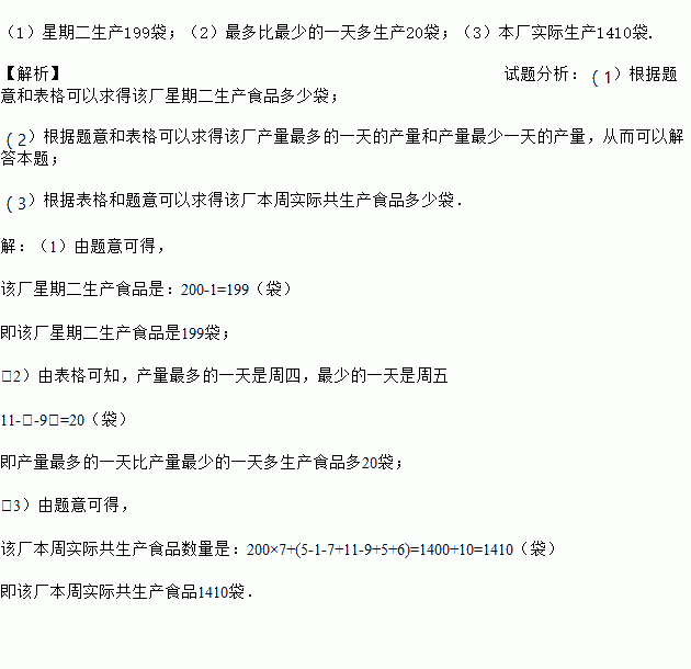 (1)星期二生产199袋;(2)最多比最少的一天多生产20袋;(3)本厂实际生产1410袋. 【解析】试题分析:(1)根据题意和表格可以求得该厂星期二生产食品多少袋; (2)根据题意和表格可以求得该厂产量最多的一天的产量和产量最少一天的产量,从而可以解答本题; (3)根据表格和题意可以求得该厂本周实际共生产食品多少袋. 【解析】 (1)由题意可得, 该厂星期二生产食...
