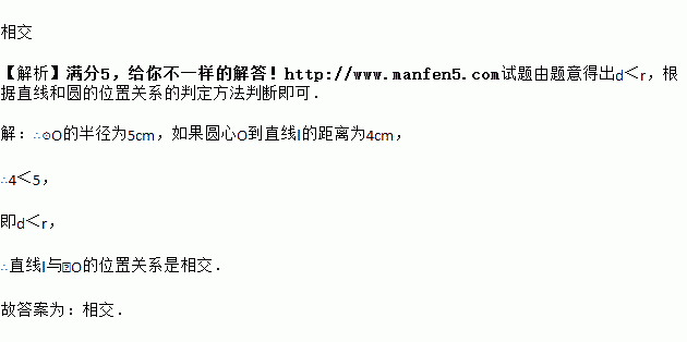 已知⊙O的半径为5cm,圆心O到直线l的距离为4cm,那么直线l与⊙O的位置关系是______-.