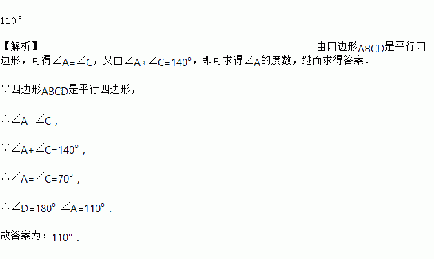 在□ABCD中,若∠A+∠C=140°,那么∠D=_____.