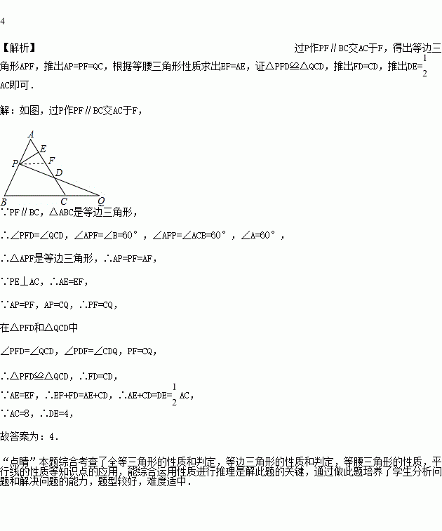 如图,过边长为8的等边的边AB上一点P,作于,为 延长线上一点,当时,连接交边于,则的长为________.