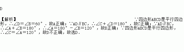 在平行四边形ABCD中,∠B=60°,那么下列各式中,不能成立的是( )