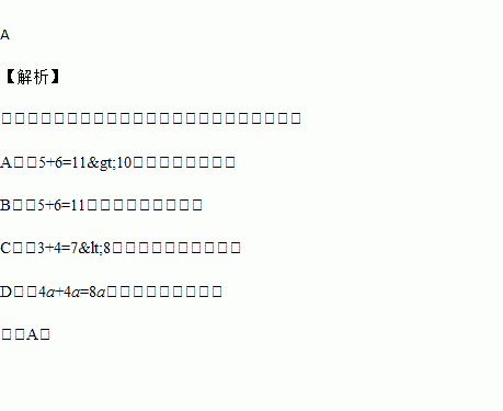 A 【解析】 试题解析:根据三角形任意两边的和大于第三边,得 A中,5+6=11>10,能组成三角形; B中,5+6=11,不能组成三角形; C中,3+4=7<8,不能够组成三角形; D中,4a+4a=8a,不能组成三角形. 故选A.
