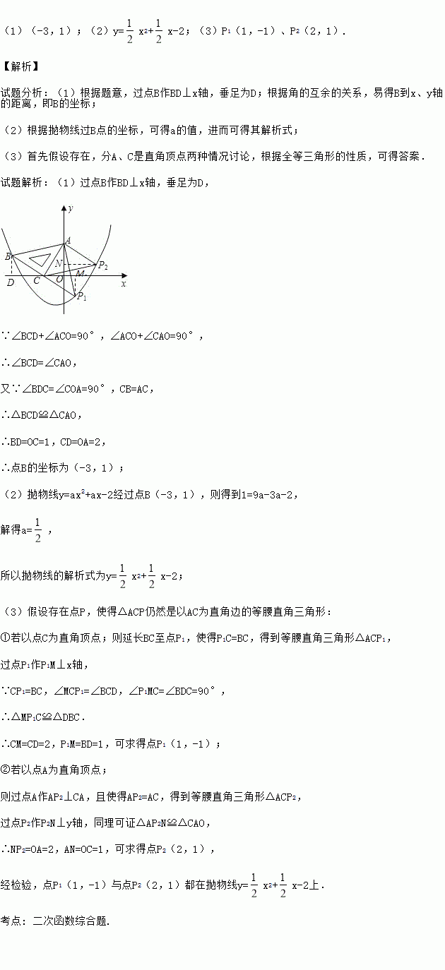 (1)(-3,1);(2)y=x2+x-2;(3)P1(1,-1)、P2(2,1). 【解析】 试题分析:(1)根据题意,过点B作BD⊥x轴,垂足为D;根据角的互余的关系,易得B到x、y轴的距离,即B的坐标; (2)根据抛物线过B点的坐标,可得a的值,进而可得其解析式; (3)首先假设存在,分A、C是直角顶点两种情况讨论,根据全等三角形的性质,可得答案. 试题解析:(...操作:在△ABC中,AC=BC=2,∠C=90°,将一块等腰三角形板的直角顶点放在斜边AB的中点P处,将三角板绕点P旋转,三角板的两直角边分别交射线AC、CB于D、E两点。图①,②,③是旋转三角板得到的图形中的3种情况。研究: