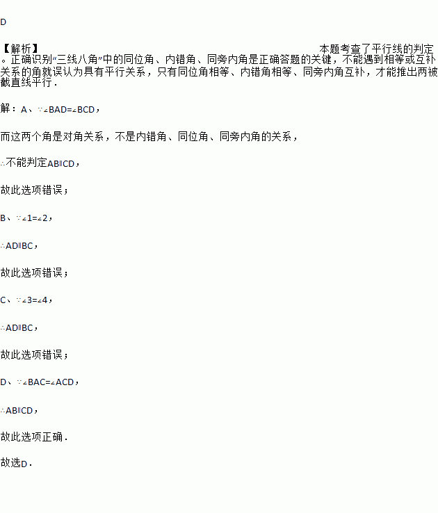 A. ∠BAD=∠BCD B. ∠1=∠2 C. ∠3=∠4 D. ∠BAC=∠ACD