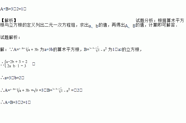 若A=为a+3b的算术平方根,B=为1﹣a2的立方根,求A+B的值.