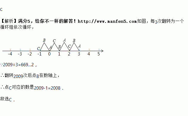 等边△ABC在数轴上的位置如图所示,点A、C对应的数分别为0和-1,若△ABC绕顶点沿顺时针方向在数轴上连续翻转,翻转1次后,点B所对应的数为1,则连续翻转2009次后,点B( )