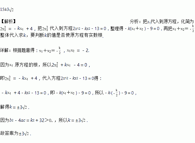 已知关于x的一元二次方程2x2+kx-4=0的两根分别为x1,x2.若2x12-kx2-13=0.则k的值为 _____________
