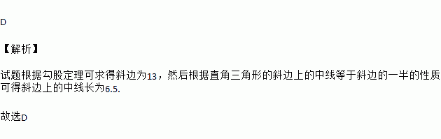 直角三角形中,两直角边分别是12和5,则斜边上的中线长是( )