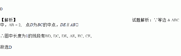 如图,在等边三角形ABC中,AB=2,点D为BC的中点,DE∥AB交AC于点E,过点E作EF⊥DE,交BC的延长线于点F,则图中长度为1的线段有( )