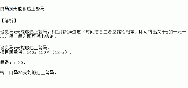 译文:良马平均每天能跑240里,驽马平均每天能跑150里.现驽马出发12天后良马从同一地点出发沿同一路线追它,问良马多少天能够追上驽马?