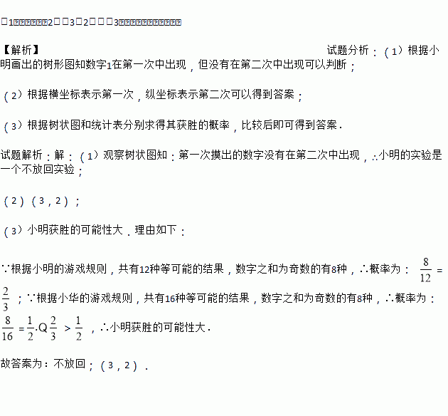 (1)根据小明画出的树形图分析,他的游戏规则是,随机抽出一张卡片后 (填“放回”或“不放回”),再随机抽出一张卡片;