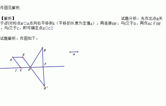 已知A、B两点在直线的同侧,试在上找两点C和D(CD的长度为定值),使得AC+CD+DB最短(保留作图痕迹,不要求写画法)。