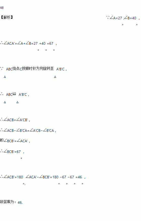 (2016·温州中考)如图,将△ABC绕点C按顺时针方向旋转至△A′B′C,使点A′落在BC的延长线上.已知∠A=27°,∠B=40°,则∠ACB′=________度.