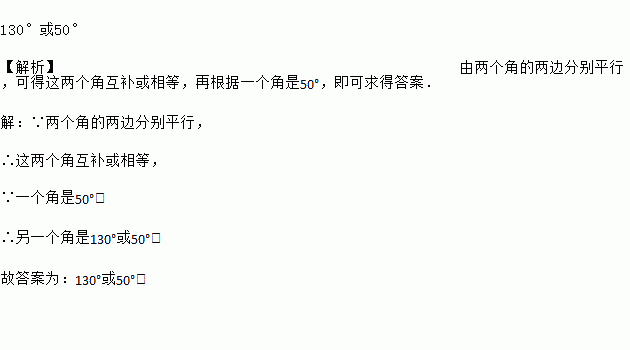 两个角的两边分别平行,一个角是50°,那么另一个角是__________.