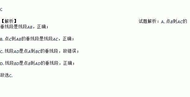 C ¡¾½âÎö¡¿ÊÔÌâ½âÎö£ºA. µãBµ½ACµÄ´¹Ïß¶ÎÊÇÏß¶ÎAB£¬ÕýÈ·£» B. µãCµ½ABµÄ´¹Ïß¶ÎÊÇÏß¶ÎAC£¬ÕýÈ·£» C. Ïß¶ÎADÊǵãAµ½BCµÄ´¹Ï߶Σ¬¹Ê´íÎó£» D. Ïß¶ÎBDÊǵãBµ½ADµÄ´¹Ï߶Σ¬ÕýÈ·£» ¹ÊÑ¡C.