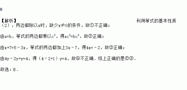 B 【解析】利用等式的基本性质(2),两边都除以x时,缺少x≠0的条件,故①不正确; 由a=b,等式的两边都乘以c2,得ac2=bc2,故②正确; 由x+7=5﹣3x,等式的两边都加上3x﹣7,得4x=﹣2,故③正确; 由4y﹣2y+y=4,得(4﹣2+1)y=4,故④不正确.综上正确的是②③. 故选:B.