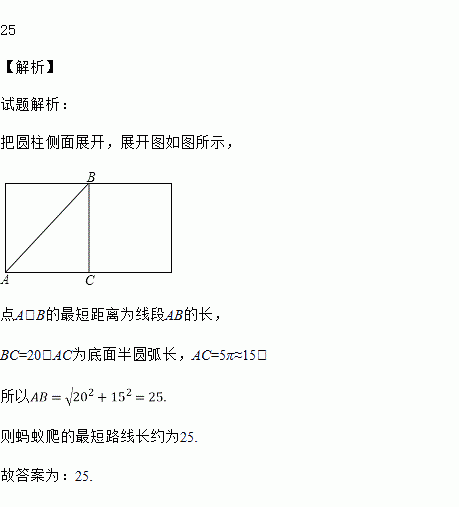 如图,有一个圆柱体,它的高为20,底面半径为5.如果一只蚂蚁要从圆柱体下底面的A点,沿圆柱表面爬到与A相对的上底面B点,则蚂蚁爬的最短路线长约为__________(π取3).