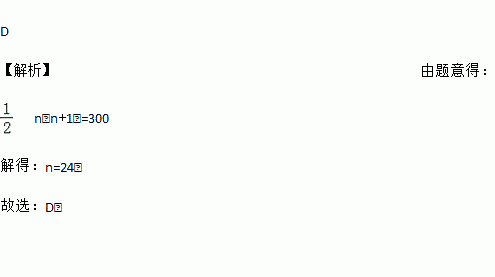 D 【解析】由题意得: n(n+1)=300 解得:n=24. 故选:D.