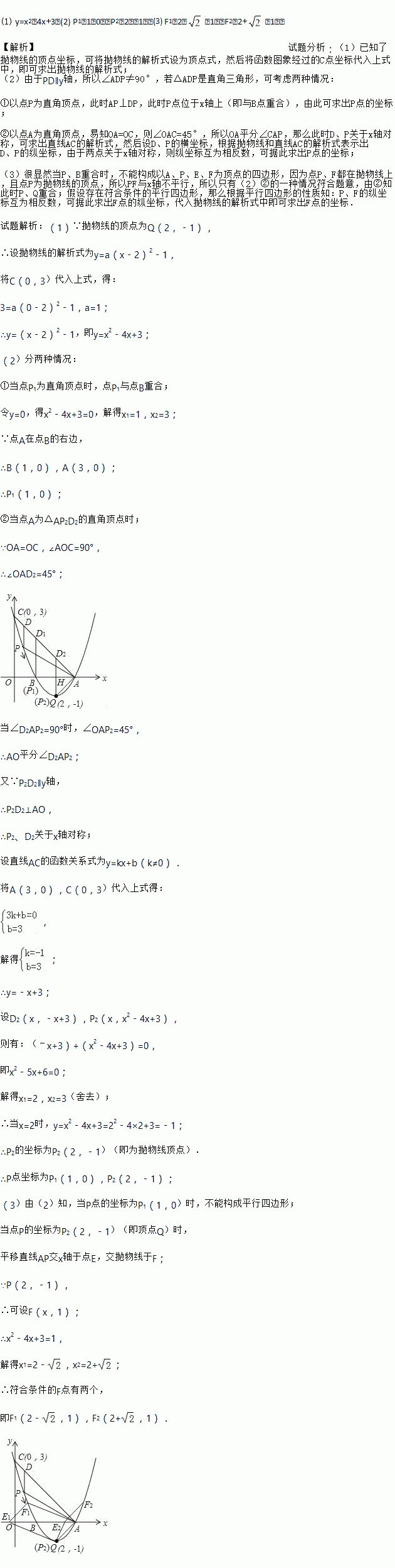 (3)在题(2)的结论下,若点E在x轴上,点F在抛物线上,问是否存在以A、P、E、F为顶点的平行四边形?若存在,求点F的坐标;若不存在,请说明理由.