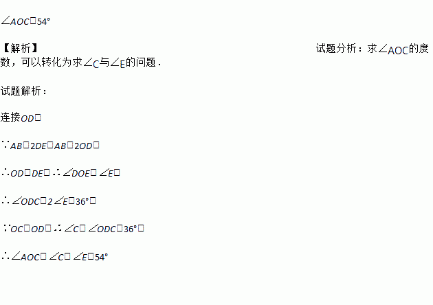 如图,AB是⊙O的直径,CD是⊙O的弦,AB、CD的延长线相交于点E.已知AB=2DE,∠E=18°.试求∠AOC的度数.