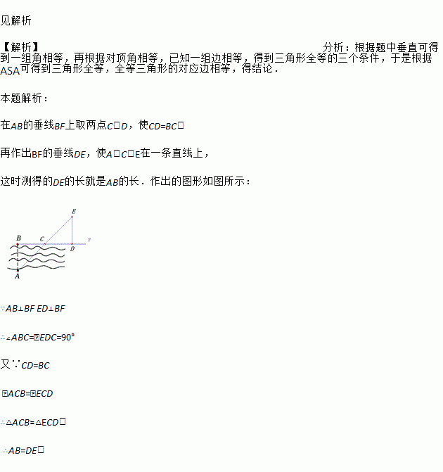 如图所示,要测量河两岸相对的两点A、B的距离,因无法直接量出A、B两点的距离,请你设计一种方案,求出A、B的距离,并说明理由.
