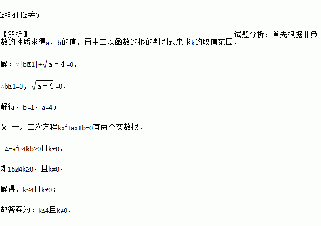 若|b-1|+ =0,且一元二次方程kx2+ax+b=0有两个实数根,则k的取值范围是________
