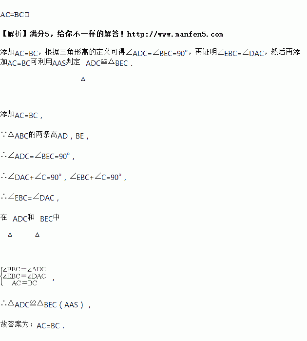 如图,△ABC的两条高AD,BE相交于点F,请添加一个条件,使得△ADC≌△BEC(不添加其他字母及辅助线),你添加的条件是_____.